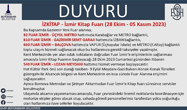 İzmir Büyükşehir Belediyesi ev sahipliğinde bu yıl ikinci kez düzenlenecek İZKİTAP - İzmir Kitap Fuarı, 28 Ekim 2023 Cumartesi günü kapılarını açmaya hazırlanıyor. Fuar İzmir’de açılacak İZKİTAP Fuarı için ESHOT Genel Müdürlüğü, Gaziemir’deki fuar alanına giden otobüs hatlarına takviye yaptı.Fuar İzmir’e; Karabağlar ve metro bağlantılı 92 numaralı Fuar İzmir - Üçyol Metro hattı, İZBAN bağlantılı 610 numaralı Fuar İzmir - Gaziemir Semt Garajı hattı, vapur (Üçkuyular İskele) ve metro (Fahrettin Altay) bağlantılı 650 numaralı Fuar İzmir - Balçova hattıyla toplu ulaşım hizmeti sağlanacak.
