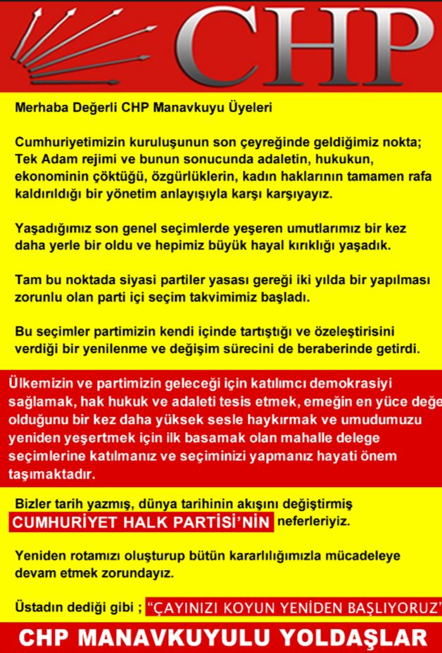 Yaşadığımız son genel seçimlerde yeşeren umutlarımız bir kez daha yerle bir oldu ve hepimiz büyük hayal kırıklığı yaşadık. Tam bu noktada siyasi partiler yasası gereği iki yılda bir yapılması zorunlu olan parti içi seçim takvimimiz başladı. Bu seçimler partimizin kendi içinde tartıştığı ve özeleştirisini verdiği bir yenilenme ve değişim sürecini de beraberinde getirdi. Ülkemizin ve partimizin geleceği için katılımcı demokrasiyi sağlamak, hak hukuk ve adaleti tesis etmek, emeğin en yüce değer olduğunu bir kez daha yüksek sesle haykırmak ve umudumuzu yeniden yeşertmek için ilk basamak olan mahalle delege seçimlerine katılmanız ve seçiminizi yapmanız hayati önem taşımaktadır.