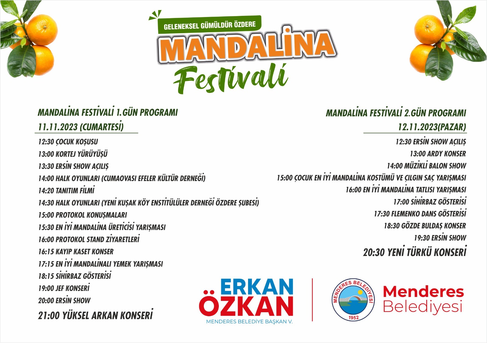Menderes Belediyesi tarafından Geleneksel Gümüldür-Özdere Mandalina Festivali 11-12 Kasım tarihleri arasında Gümüldür Eski Köy Meydanı’nda yapılacak. 2 gün boyunca mandalinaya dair her şeyin yer alacağı festival renkli görüntülere sahne olacak.Coşkuyla kutlanacakFestival kapsamında çeşitli etkinlikler, ikramlar, yarışmalar, konserler, çocuk oyun parkurları ve çeşitli sürprizler katılımcılarla buluşacak. Etkinliğin ilk gününde çocuk koşusu, kortej yürüyüşü, Ersin şov, halk dansları, en iyi mandalina üreticileri yarışması, Kayıp Kaset konseri, yemek yarışması, sihirbaz gösterisi, Jef konseri ve Yüksel Arkan konseri olacak. Menderes Belediyesi Geleneksel Gümüldür-Özdere Mandalina Festivali’nin ikinci günü ise Ersin şov ile başlayacak. Ersin şov sonrası Ardy konseri gerçekleşirken konser sonrası müzikli balon şov ile çocuk yarışmacıların katılımıyla en iyi mandalina kostümü ve çılgın saç yarışması yapılacak. En iyi mandalina tatlısının da seçileceği festivalin ikinci gününde sihirbaz gösterisi, flemenko dans gösterisi, Gözde Buldaş konseri gerçekleşecek. Festival Yeni Türkü konseri ile son bulacak.