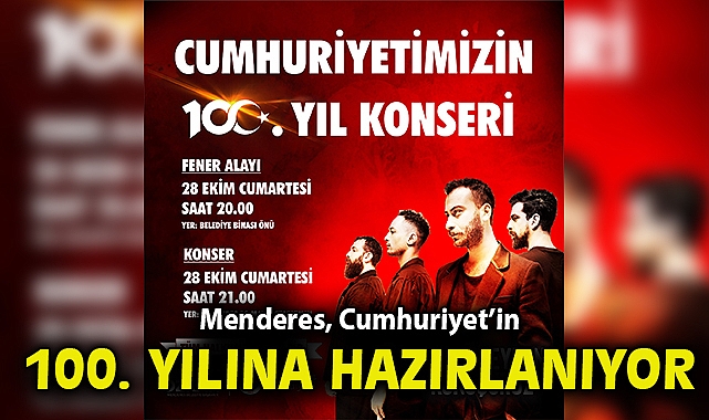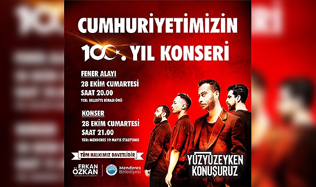 Cumhuriyetin 100. yılı Menderes’te büyük bir coşkuyla kutlanacak. Menderes Belediyesi tarafından düzenlenecek kutlamalar kapsamında Yüzyüzeyken Konuşuruz Grubu da Mendereslilerle buluşacak.