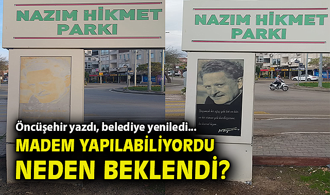 İzmir'in Dikili ilçesinde dünyaca ünlü şairimiz Nazım Hikmet Ran'ın görselinin bakımsızlığı çevredeki vatandaşlar tarafından tepkiyle karşılanmıştı. Bölge halkının isyanlarının Öncüşehir Gazetesi kamuoyunun gündemine getirirken, Dikili Belediyesi ise yaptığı yanlıştan geri adım attı.GÖRSEL YENİLENDİNazım Hikmet Parkı'ndaki Nazım Hikmet Ran'a ait görsel ve yazıların silinmesine yönelik tepkileri ÖNCÜŞEHİR'in gündeme getirmesinin ardından harekete geçen Dikili Belediyesi harekete geçerek görsel ve yazıları yeniledi.Yapılan düzenleme sonrası ise vatandaşlarla 'madem yapılabiliyordu neden ilçemiz kötü anıldıktan sonra yapıldı?' sorularını yönelterek belediyeye tepki gösterdi.
