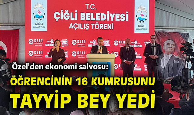 İktidara eleştirilerde bulunan Özel, “Bir yanda sıcak salonlarda atadığı kişilere kendisini alkışlatan Tayyip Erdoğan CHP'yi iftira etmeye, hakaret etmeye devam etsin. Salon siyasetçisi Tayyip Bey'e İzmir'den kışta, sokakta ve çok sayıda Çiğliliğiyle birlikte sesleniyorum. 110’uncu kent lokantasını açıyoruz Tayyip Bey. Senin yoksullaştırdıklarına sahip çıkmak için 110’uncu kent lokantasını açıyoruz. Burada senin açıp da unuttuğun sadece sayısıyla övündüğün üniversitelerden bir tanesi Katip Çelebi Üniversitesi var. Öğrencilerin barınmasını düşünmezsin. Üç kuruş KYK kredisine muhtaç hale getirirsin. Bu öğrencilere çorba dağıtmak isteriz. Ona bile izin vermemeye kalkarsın. Ama o öğrencileri Çiğli Kent Lokantası'na dört kap yemeği, yarım çorba fiyatına içmeye bunu da alamayacak öğrenciler için Çiğlilileri lokantamızda askıda yemek uygulaması var. Yoksul öğrencilerin gelip bedava karınlarını doyurabilmesi için o askılara yemekleri asmaya davet ediyorum” diye konuştu.