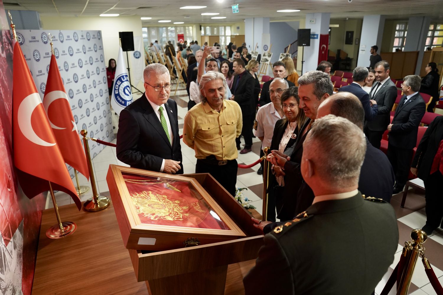 “Nöbetimizi bir yıl boyunca layıkıyla yerine getireceğiz”Maneviyatı yüksek olan kutlu emanete sahip çıkacaklarını dile getiren Prof. Dr. Budak, “Biz, üniversite olarak bu kutlu nöbeti, bir yıl boyunca layıkıyla yerine getirmek için gerekli tüm gayreti göstereceğimizin, bir kez daha büyük bir gururla altını çizmek ve ifade etmek isterim. 57. Alay Sancağının temsil ettiği tüm değerler, bütün öğrencilerimiz, personelimiz ve vatandaşlarımız tarafından daha iyi anlaşılması ve paylaşılması için Ege Üniversitesi Merkez Kütüphanesinde sergilenmek üzere ziyarete açılacaktır” dedi.Rektör Budak’ın konuşmasının ardından EÜ Atatürk İlkeleri ve İnkılap Tarihi Uygulama ve Araştırma Merkezi Müdürü Prof. Dr. Nuri Karakaş, 57. Alay’ın önemi, tarihteki başarıları ve Çanakkale Zaferi ile ilgili bilgiler içeren bir konuşma gerçekleştirdi. Konuşmaların ardından EÜ Birgivi İslami Bilimler Fakültesi Öğr. Gör. Osman Bostancı tarafından 57. Alay Şehitleri anısına Kuran’ı Kerim tilaveti yapıldı. Etkinlik sonunda katılımcılar “Çanakkale Kara Muharebeleri” sergisini gezdiler.