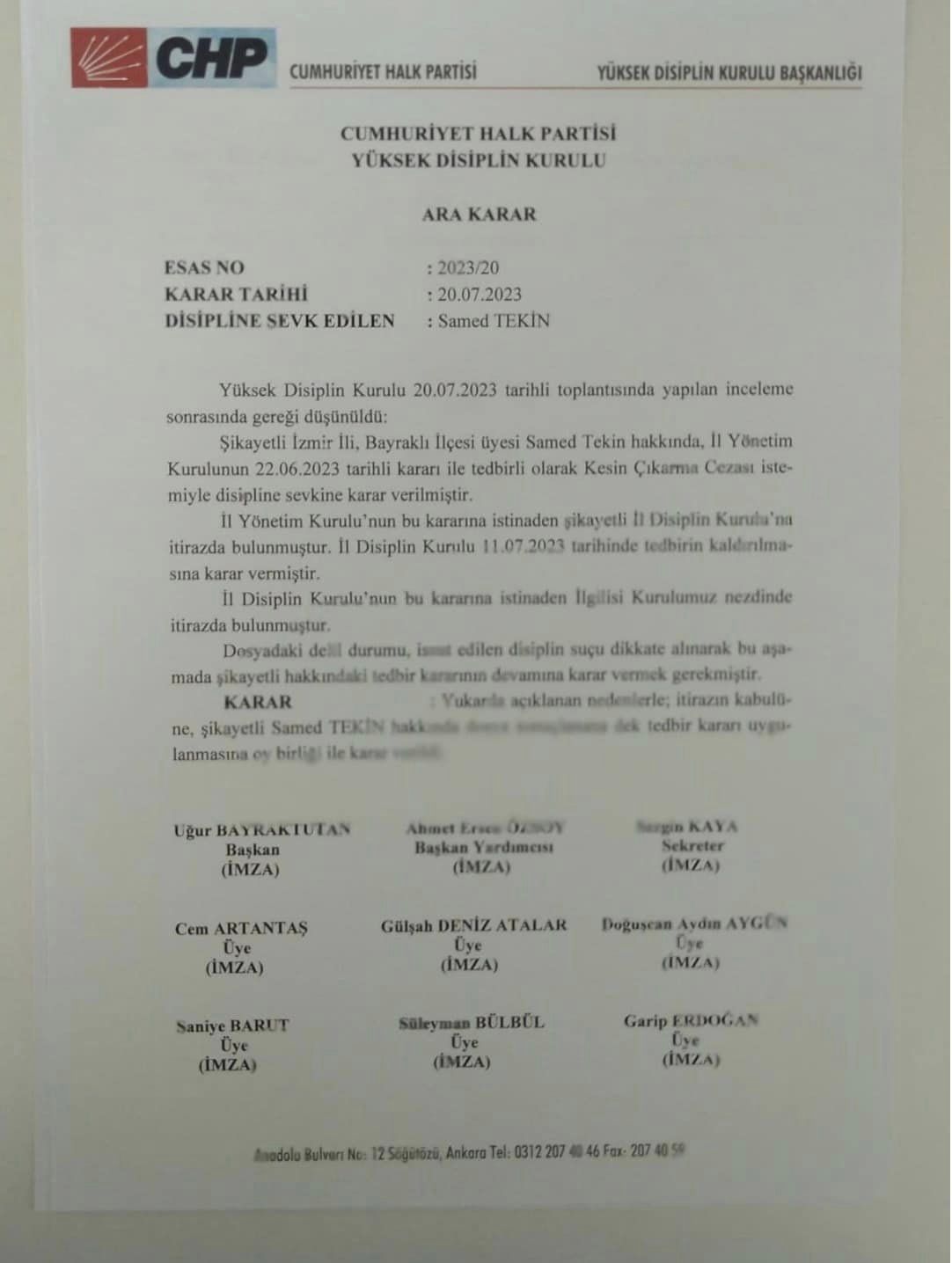 Geçtiğimiz haftalarda dönemin ilçe başkan adayları arasında yer alan Av. Samed Tekin, yaptığı paylaşımlarla partiyi kamuoyunda tartışılır hale getirdiği gerekçesiyle tedbirli ve kesin ihraç cezası istemi ile il disiplin kuruluna sevk edilmişti.