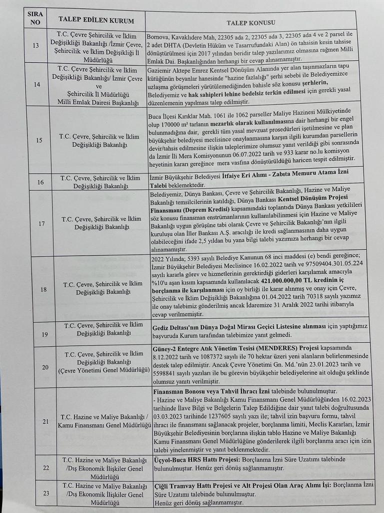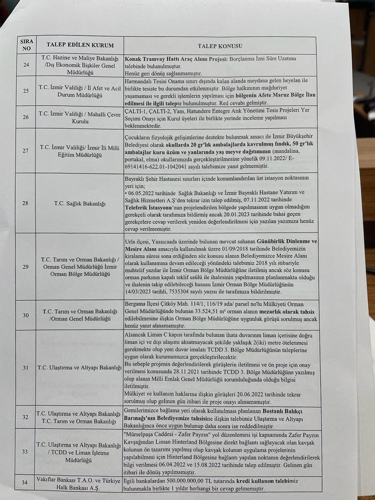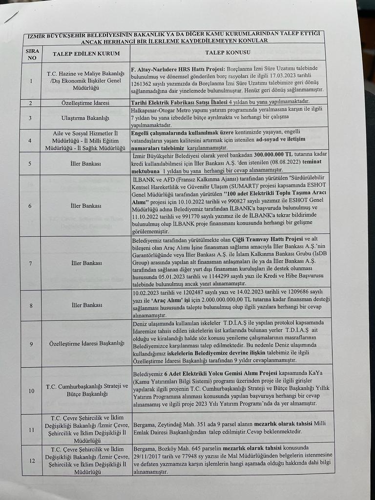 Mektubu okuduktan sonra AK Parti Grup Başkanvekili Özgür Hızal’a dönen Başkan Soyer, “Değerli Özgür Hızal, sizden rica ediyorum. Maliye Bakanımıza ya da Cumhurbaşkanımıza birlikte gidelim. Ne zaman derseniz. En azından Narlıdere Metrosunun 30 milyon Euro’luk son diliminin onayının verilmesi adına gidelim” ifadelerini kullandı.