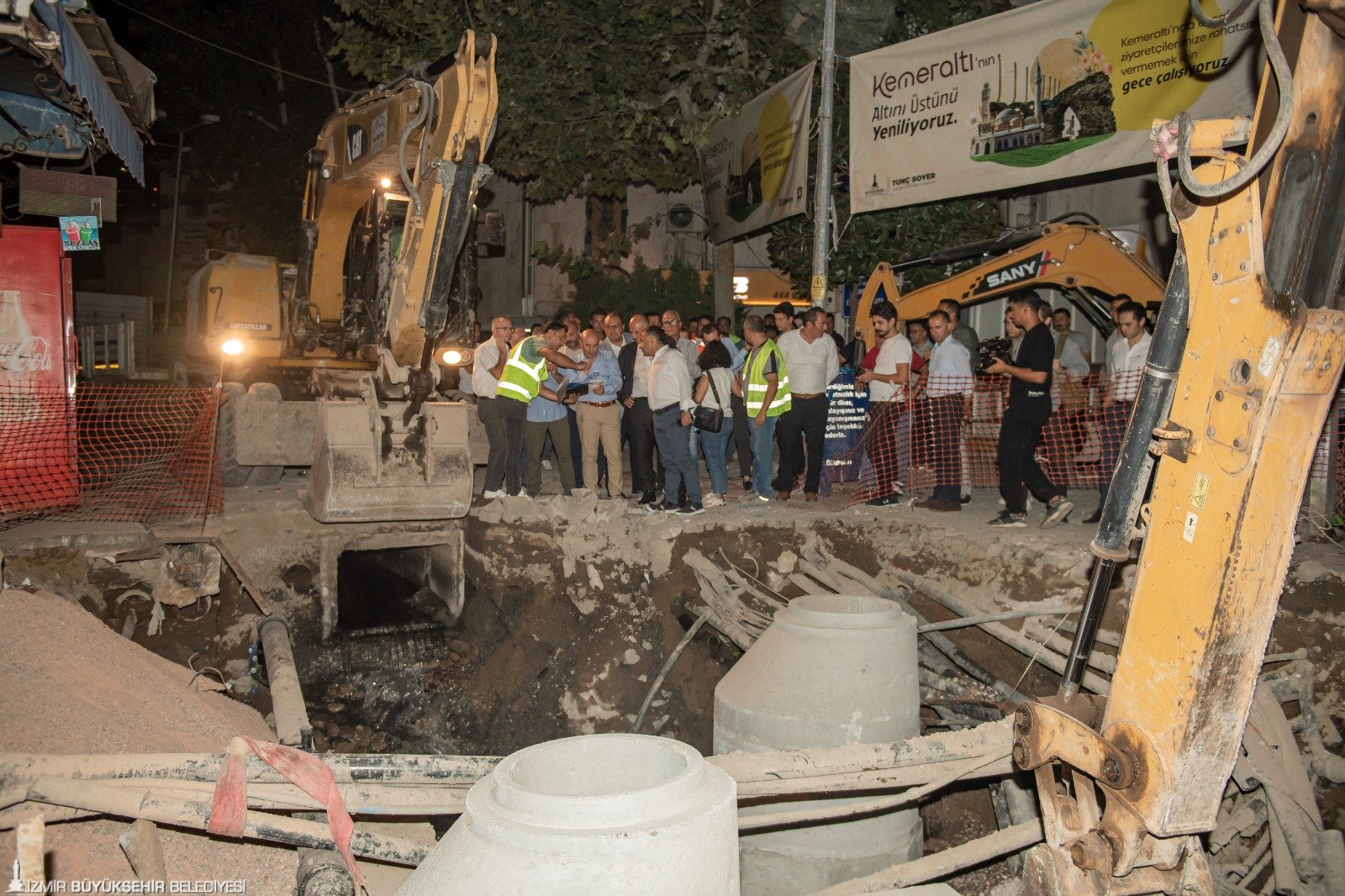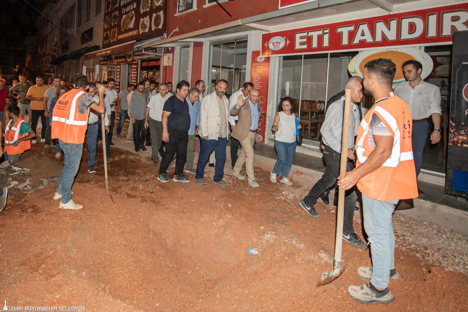 İzmir Büyükşehir Belediye Başkanı Tunç Soyer’in Konak ile Kadifekale arasındaki tarihi aksı canlandırma ve bölgenin cazibesini artırma hedefi doğrultusunda Kemeraltı'nda başlatılan tarihi yatırımlar devam ediyor. Altyapı ve üstyapı çalışmalarının beraber ilerlediği Kemeraltı'nda atık su, yağmur suyu ve içme suyu hatları ile aydınlatma, gerilim hatları yenileniyor, yollar beton ile kaplanıyor ve granit döşeniyor. Kemeraltı’nı sık sık ziyaret eden İzmir Büyükşehir Belediye Başkanı Tunç Soyer, dün tarihi çarşıda saat gece yarısına yaklaşırken yürütülen çalışmaları inceledi. kemeraltı turuna İYİ Parti Kalkınma Politikaları Başkanı Prof. Dr. Ümit Özlale, İZSU Genel Müdürü Ali Hıdır Köseoğlu, İzmir Büyükşehir Belediyesi Genel Sekreter Yardımcısı Özgür Ozan Yılmaz, Kemeraltı Esnaf Derneği Başkanı Semih Girgin, Konak Mahallesi Muhtarı Tamer Yıldırım ile belediye bürokratları katıldı.