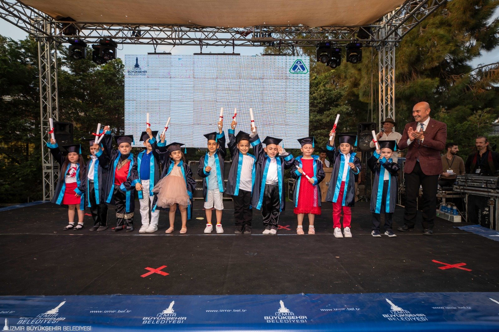 İzmir Büyükşehir Belediyesi'ne bağlı, kent merkezi dışında Dikili, Kemalpaşa, Beydağ ve Aliağa’da da hizmet veren toplam 11 İZELMAN anaokulunun öğrencileri mezun oldu. İzmir Büyükşehir Belediye Başkanı tunç soyer erken çocukluk döneminde erişilebilir eğitim hizmeti sunan İZELMAN anaokullarındaki öğrencilerin mezuniyet heyecanını aileleriyle paylaştı. Tarihi Havagazı Fabrikası’ndaki mezuniyet törenine Başkan Tunç Soyer’in yanı sıra Beydağ Belediye Başkanı Feridun Yılmazlar, İzmir Büyükşehir Belediyesi Başkan Vekili Mustafa Özuslu, İzmir Büyükşehir Belediyesi Genel Sekreteri Barış Karcı, İZELMAN Yönetim Kurulu Başkanı Erhan Bey, İZELMAN Genel Müdürü Burak Alp Ersen, İzmir Büyükşehir Belediyesi Genel Sekreter Yardımcısı Ertuğrul Tugay ve öğrenci velileri katıldı. mezuniyet töreni miniklerin oluşturduğu Sürdürülebilirlik Korosu’nun şarkılarıyla başladı. Yeni öğrencilere bayraklarını teslim eden mezunlar Başkan Soyer’e çiçek takdim etti. Törende geçen Ağustos ayında hayatını kaybeden İZELMAN Yönetim Kurulu Başkanı Adnan Oğuz Akyarlı da anıldı.