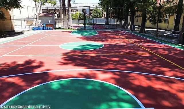 İzmir Büyükşehir Belediyesi, gençlerin spor motivasyonunu artırmak için Atatürk Lisesi’nde bulunan açık spor alanlarının zeminini yeniledi. Renklendirme çalışmalarının ardından sahalar iç açıcı bir görünüme kavuştu.