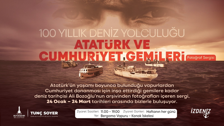 İzmir Büyükşehir Belediyesi iştiraki İZDENİZ A.Ş.’nin organize ettiği Büyük Önder Mustafa Kemal Atatürk’ün denizlerde bağımsızlığa ve denizciliğe verdiği önemi anlatan “100 Yıllık Deniz Yolculuğu: Atatürk ve Cumhuriyet Gemileri Fotoğraf Sergisi İzmirlilerle buluştu. Konak İskelesi’ne demirli Bergama Vapuru’nda düzenlenen serginin açılışına İzmir Büyükşehir Belediyesi Başkan Vekili Murat Aydın, İzmir Büyükşehir Belediyesi Genel Sekreteri Barış Karcı, İzmir Büyükşehir Belediyesi Genel Sekreter Yardımcısı Ertuğrul Tugay, İMEAK Deniz Ticaret Odası İzmir Şubesi Yönetim Kurulu Başkanı Yusuf Öztürk, İZDENİZ Genel Müdürü Ümit Yılmaz, deniz tarihçisi Ali Bozoğlu ve İzmirli sanatseverler katıldı.