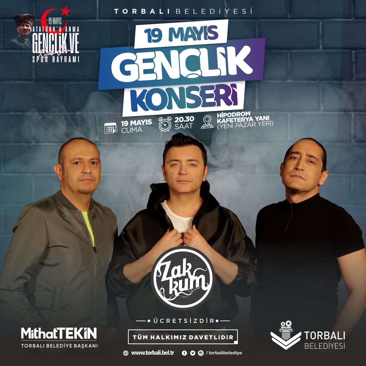 Torbalı Belediyesi, Gazi Mustafa Kemal Atatürk’ün Samsun’a çıkarak yaktığı İstiklal Meşalesini 104’üncü yıl dönümünde Torbalılıları sevilen müzik grubu ZAKKUM ile buluşturacak. 19 Mayıs Atatürk’ü Anma, Gençlik ve Spor Bayramı coşkusunun doyasıya yaşanacağı konser, 19 Mayıs Cuma günü saat 20:30’da Hipodrom Kafe yanında bulunan Yeni Pazar Yeri’nde gerçekleştirilecek. Torbalı Belediyesi konser öncesi hazırlıklarını büyük ölçüde tamamlarken rengârenk ve coşku dolu bir atmosfer oluşacak olan konsere yoğun ilgi olması bekleniyor. BAŞKAN TEKİN’DEN KONSERE DAVET Cuma akşamı gerçekleşecek olan Gençlik Konserine ilçe sakinlerini davet eden Torbalı Belediye Başkanı Mithat Tekin, “19 Mayıs Atatürk’ü Anma, Gençlik ve Spor Bayramı nedeniyle düzenleyeceğimiz Gençlik Konserinde Zakkum’u ilçemizde ağırlayacağız. Ücretsiz konserimize tüm halkımız davetlidir. Ulu Önder Gazi Mustafa Kemal önderliğinde 104 yıl önce Cumhuriyetimizin temellerinin atıldığı bu önemli günü gelin hep beraber kutlayalım. ” ifadelerini kullandı.