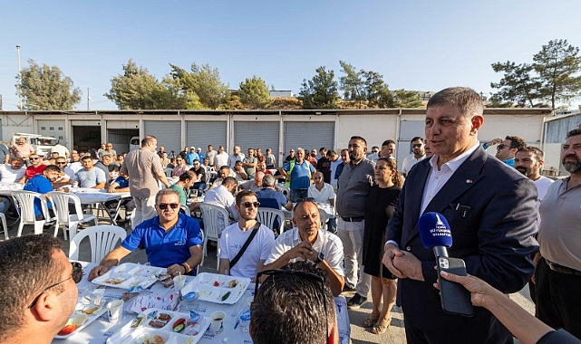 İzmir Büyükşehir Belediye Başkanı Dr. Cemil Tugay, cuma günü sabahın ilk saatlerinde Fen İşleri Dairesi Başkanlığı'nın Bornova'da bulunan şantiyesinde işçilerle kahvaltıda buluştu. Kilit parke, taş, kaynak ustaları, vinç operatörleri gibi yaklaşık 400 personel işe başlamadan önce Başkan Tugay'la bir araya gelerek, yaptıkları çalışmalar hakkında bilgi verdi. İzmir Büyükşehir Belediyesi Fen İşleri Dairesi Başkanı Selahattin Mamikoğlu ile sendika temsilcilerinin karşıladığı Başkan Tugay, “Sizlerle bu ortamda olmak, aynı sofrayı paylaşmak bana büyük gurur ve mutluluk verdi. Sizlere minnettarız” dedi.