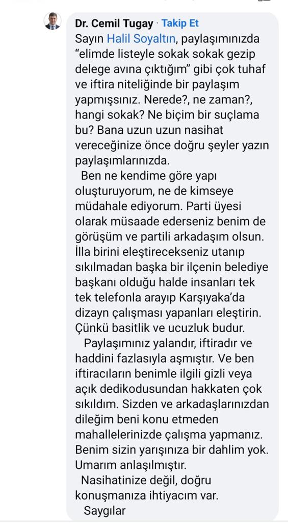 “Sayın Halil Soyaltın, paylaşımınızda "elimde listeyle sokak sokak gezip delege avına çıktığım" gibi çok tuhaf ve iftira niteliğinde bir paylaşım yapmışsınız. Nerede?, ne zaman?, hangi sokak? Ne biçim bir suçlama bu? Bana uzun uzun nasihat vereceğinize önce doğru şeyler yazın paylaşımlarınızda.