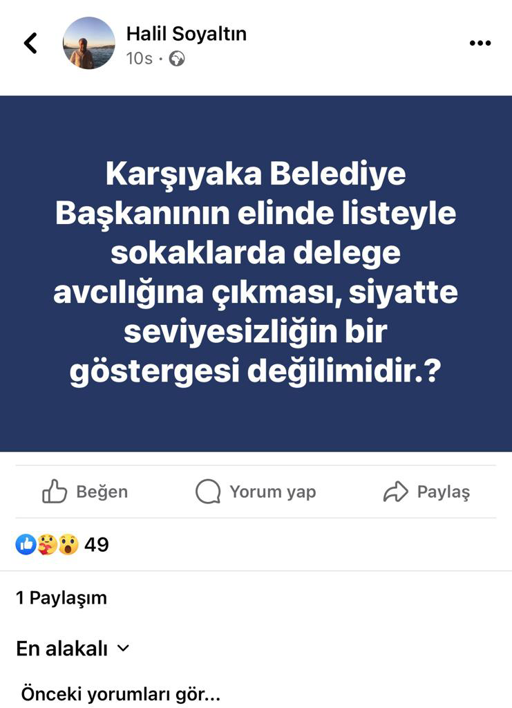 Karşıyaka’da yapılan delege seçimlerini eleştiren Halil Sayalltın adlı bir vatandaş “Karşıyaka Belediye Başkanının elinde listeyle sokaklarda delege avcılığına çıkması, siyasette seviyesizliğin bir göstergesi değil midir?” sözleriyle bir gönderi paylaştı.