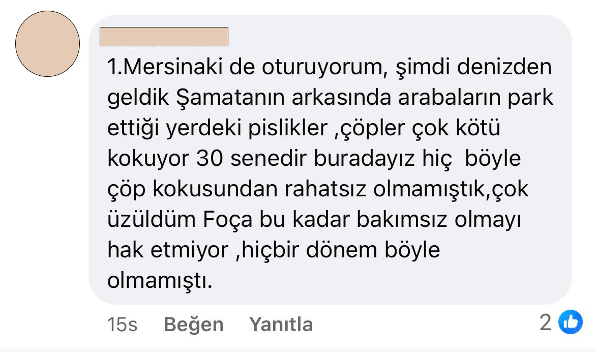 30 SENEDİR BURADAYIZ, HİÇ BÖYLE ÇÖP KOKUSUNDAN RAHATSIZ OLMAMIŞTIKFoça’nın bu kadar bakımsız olayı hak etmediği ifade eden bir vatandaş, “1.Mersinaki’de oturuyorum, şimdi denizden geldik. Şamatanın arkasında arabaların park ettiği yerdeki pislikler, çöpler çok kötü kokuyor. 30 senedir buradayız, hiç böyle çöp kokusundan rahatsız olmamıştık, çok üzüldüm. Foça bu kadar bakımsız olmayı hak etmiyor, hiçbir dönem böyle olmamıştı.