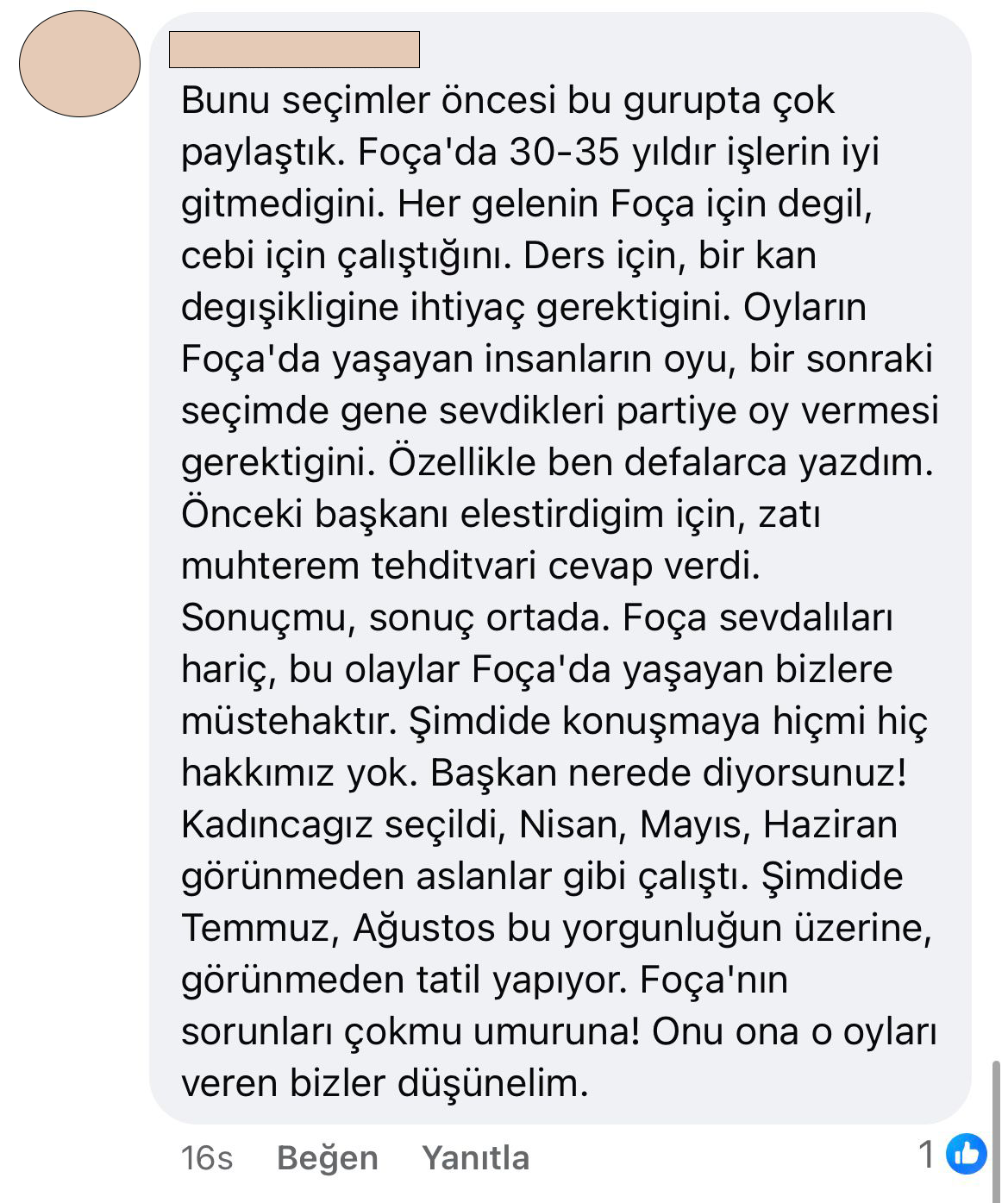 FOÇA'NIN SORUNLARI ÇOK MU UMURUNA!Başkan Fıçı’nın Foça’nın sorunlarıyla ilgilenmediğini ifade eden bir diğer vatandaş ise, “Bunu seçimler öncesi bu gurupta çok paylaştık. Foça'da 30-35 yıldır işlerin iyi gitmediğini. Her gelenin Foça için değil, cebi için çalıştığını. Ders için, bir kan değişikliğine ihtiyaç gerektiğini. Oyların Foça'da yaşayan insanların oyu, bir sonraki seçimde gene sevdikleri partiye oy vermesi gerektiğini. Özellikle ben defalarca yazdım. Önceki başkanı eleştirdiğim için, zatı muhterem tehditvari cevap verdi. Sonuç mu, sonuç ortada. Foça sevdalıları hariç, bu olaylar Foça'da yaşayan bizlere müstahaktır. Şimdide konuşmaya hiç mi hiç hakkımız yok. Başkan nerede diyorsunuz! Kadıncağız seçildi, Nisan, Mayıs, Haziran görünmeden aslanlar gibi çalıştı. Şimdide Temmuz, Ağustos bu yorgunluğun üzerine, görünmeden tatil yapıyor. Foça'nın sorunları çok mu umuruna! Onu ona o oyları veren bizler düşünelim” dedi.
