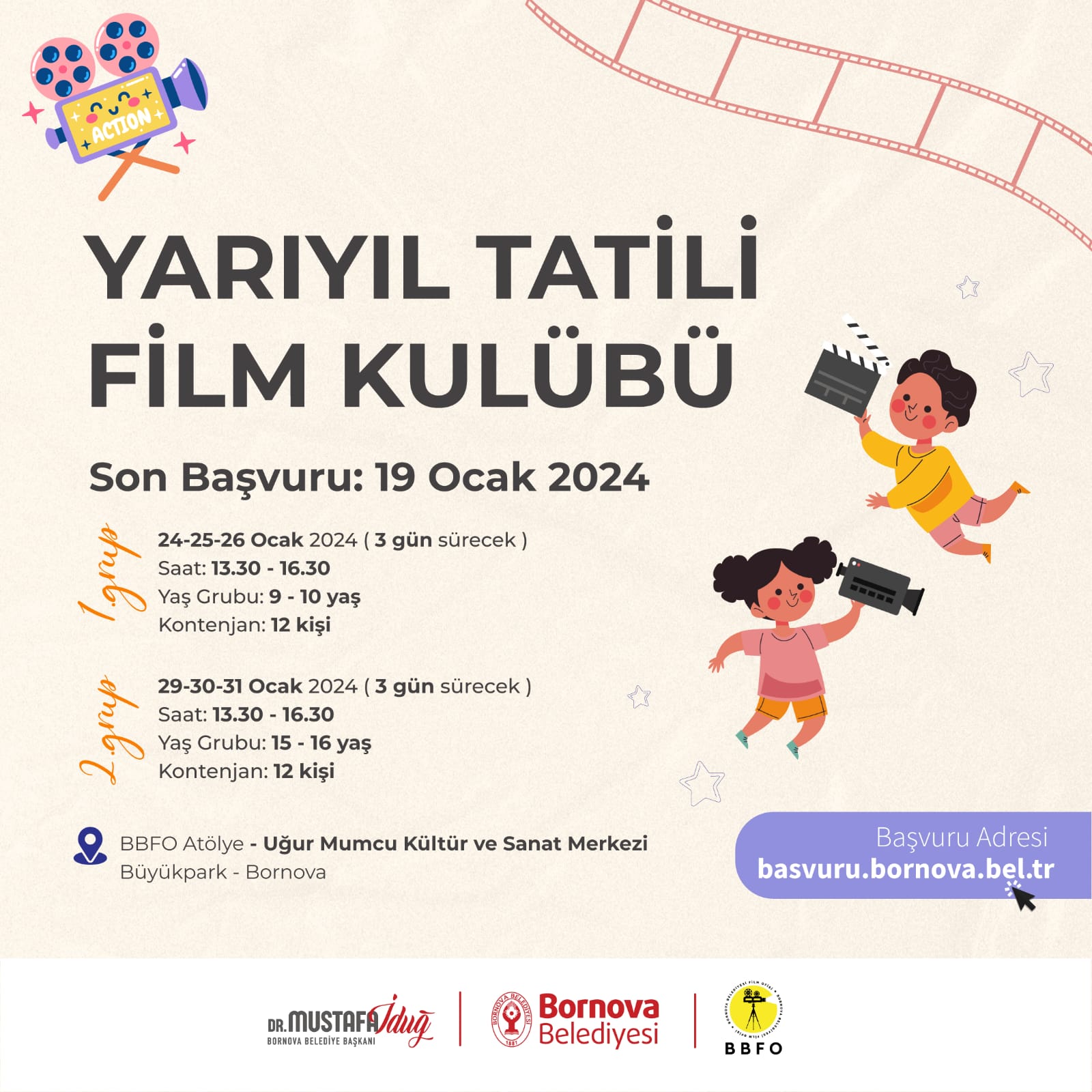Gençlere ve çocuklara sinemayı sevdirmek ve geleceğin sinemacılarını yetiştirmek amacıyla faaliyetlerini sürdüren Bornova belediyesi Film Ofisi (BBFO), yarıyıl tatilindeki öğrencilerin keyifli zaman geçirmelerini sağlamak amacıyla özel bir atölye çalışması hazırladı. Yarıyıl Tatili Film Kulübü adı ile gerçekleşecek olan etkinlikte çocuklar film izlemenin keyfini yaşarken kısa film yapma tekniklerini de öğrenecek.3 gün 3 saatUğur Mumcu Kültür ve Sanat Merkezi'nde gerçekleşecek olan atölye çalışması 24-25-26 Ocak ile 29-30 ve 31 Ocak 2024 tarihlerinde yaş gruplarına göre iki grup olarak yapılacak. 3 gün sürecek olan atölyeler günde 3 saat şeklinde gerçekleşecek. Ücretsiz olarak düzenlenen etkinlikten yararlanan Bornovalı gençler filmlerin nasıl çekildiğini öğrenerek, ekipman kullanımını deneyimleyecek ve stop-motion animasyon film yapımına adım atacak.Teknoloji ve sanatÇocukların eğitimi için Bornova Belediyesi olarak her konuda destek verdiklerini ifade eden Bornova Belediye Başkanı Dr. Mustafa İduğ, “Bornovalı çocukların kültürel ve sanatsal gelişimlerine de katkı sağlamak istiyoruz. Günümüz dijital dünyasında çocuklarımızı doğru yerlere yönlendirmemiz gerekiyor. Bu düşünce ile teknoloji ve sanatın iç içe olduğu sinema dünyasını çocuklarımıza tanıtmak istedik. Film Ofisimizin yaptığı çalışmalar bu alanda gizli kalmış yeteneklerin ortaya çıkması ve geleceğin sinemacılarının yetişmesi açısından çok değerli” dedi.Etkinliğe katılım sağlamak isteyenler ‘basvuru.bornova.bel.tr’ adresindeki başvuru formunu doldurabilir. Kontenjan her iki grup için 12 kişi ile sınırlıdır.